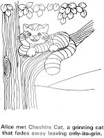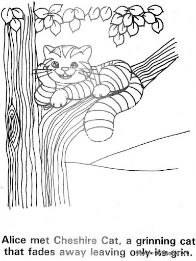 Знаменитая улыбка принадлежит Мартовскому Коту. Вот вам раскраски с этим героев, сидящем на высоком дереве. Раскраски - это замечательно: полезно для Дошкольников. А сегодня у нас, как известно, каникулы. Вот вам и будет полезный досуг.