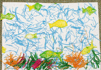 Море делали в технике аппликация из ниток. Я дала Даше большой пакет с нитками и она выбрала те, из которых нам и предстояло сделать нашу работы. Потом мы порезали нитки на мелкие кусочки и разложили по мисочкам. Даша наносила клей на белый лист картона. А потом посыпала все это нитками. Я ей немного помогала, показывала, где еще надо подсыпать ниток. После того, как фон был готов, из цветных ниток мы начали делать кораллы и водоросли. Я показывала, куда лучше приклеивать, а она с удовольствием возилась в клее и нитках. Рыбок для нашего моря мы делали из лоточков (не знаю, как называется материал. Это такие белые лоточки, по которым фасуют конфеты, овощи и т.д.) Я вырезала ножницами рыбок, а Даша раскрасила их (пальчиковые краски + ПВА, размешать). После мы приклеили их на клей к рисунку моря.