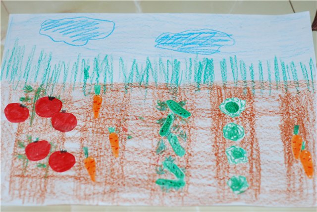 - Делали аппликации овощей. Нарисовала заготовку (огород с грядками) , нарисовала разные овощи и предложила Даше наклеить овощи на грядки. Ей это очень понравилось. Я конечно помогала, но она старалась все делать сама.