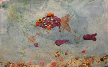 Еще одна сегодняшняя работа на конкурс посвящена рыбкам, но она ничуть не похожа на предыдущую. Её нам прислали мама Татьяна и доченька Тая. Мама с дочкой собрались в Океанариум на экскурсию и решили основательно подготовиться к поездке! Весь день Таня рассказывала Тае о рыбах, они играли в сказку с участием рыбок, читали стихи и занимались творчеством. Только посмотрите, какую красоту Тая сделала